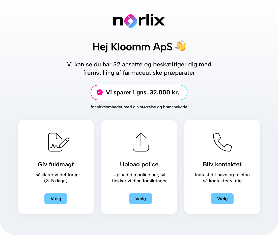 Norlix er din digitale forsikringsmægler. Indtast dit CVR nummer og lad os beregne hvor meget du kan spare